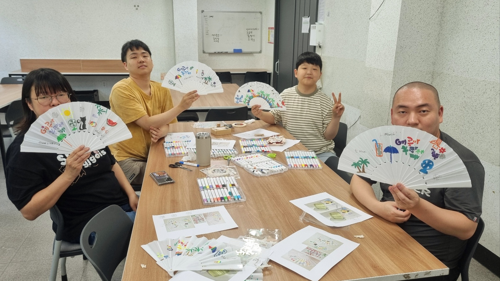 2025년 7월 취미 및 여가활동 (공예) 프로그램 최고관리자 0 53 09.23 19:50 2025년 7월 취미 및 여가활동 (공예) 프로그램그림, 색연필, 스티커 등 다양한 재료를 활용해 부채를 꾸미는 시간을 가졌습니다. 각자의 개성을 담아 부채를 완성하며 즐거움을 느꼈고, 완성된 작품을 함께 감상하며 뿌듯함을 표현하였습니다.